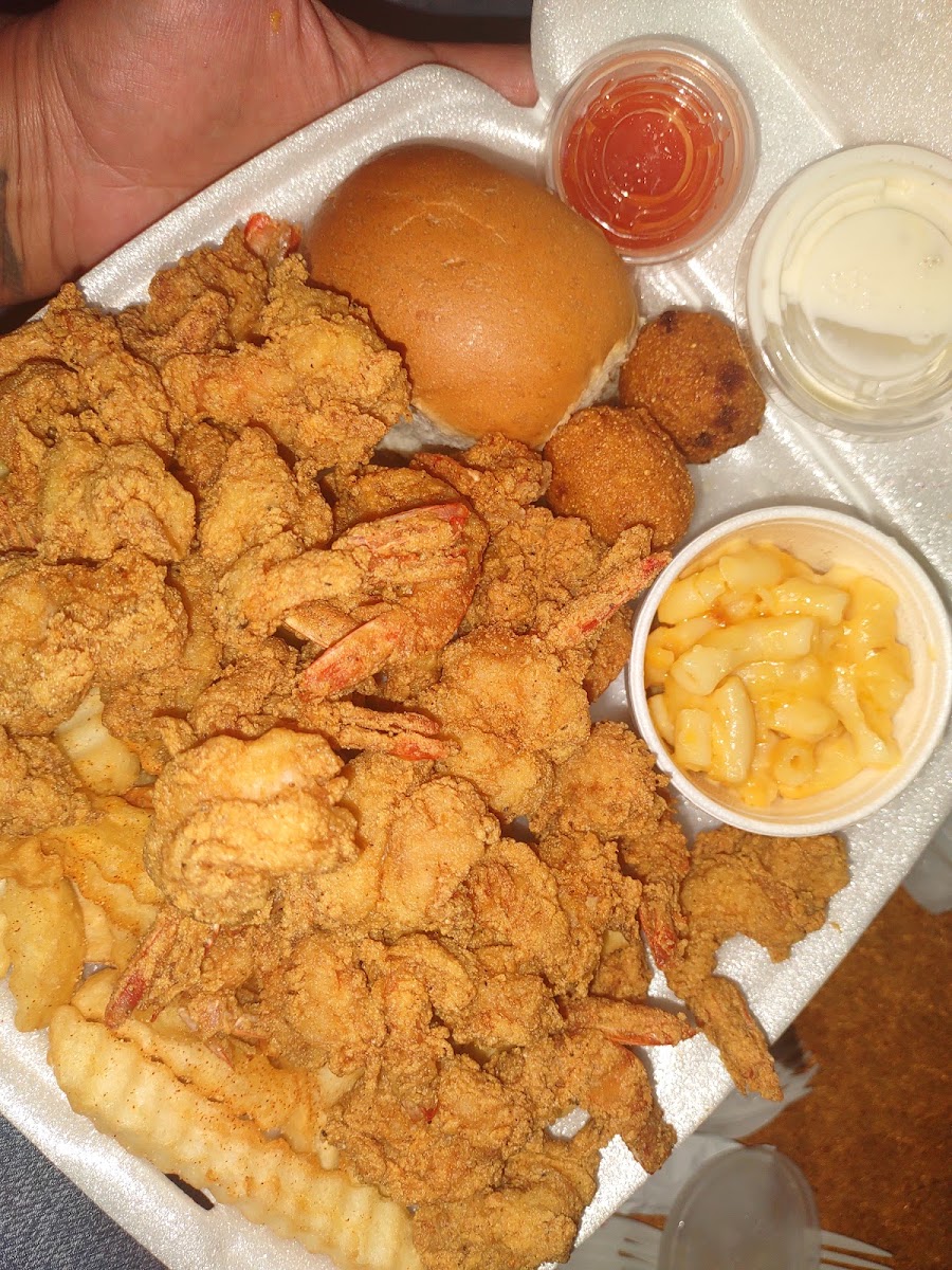 Fried Shrimp with Fries and Mac and Cheese with Hush Puppies