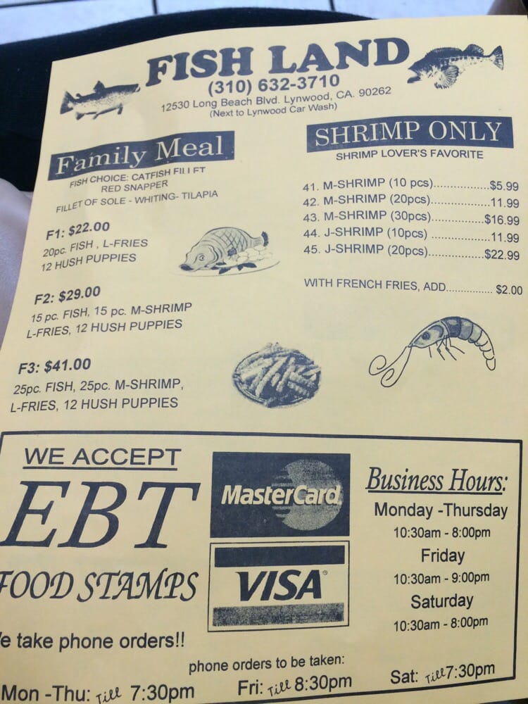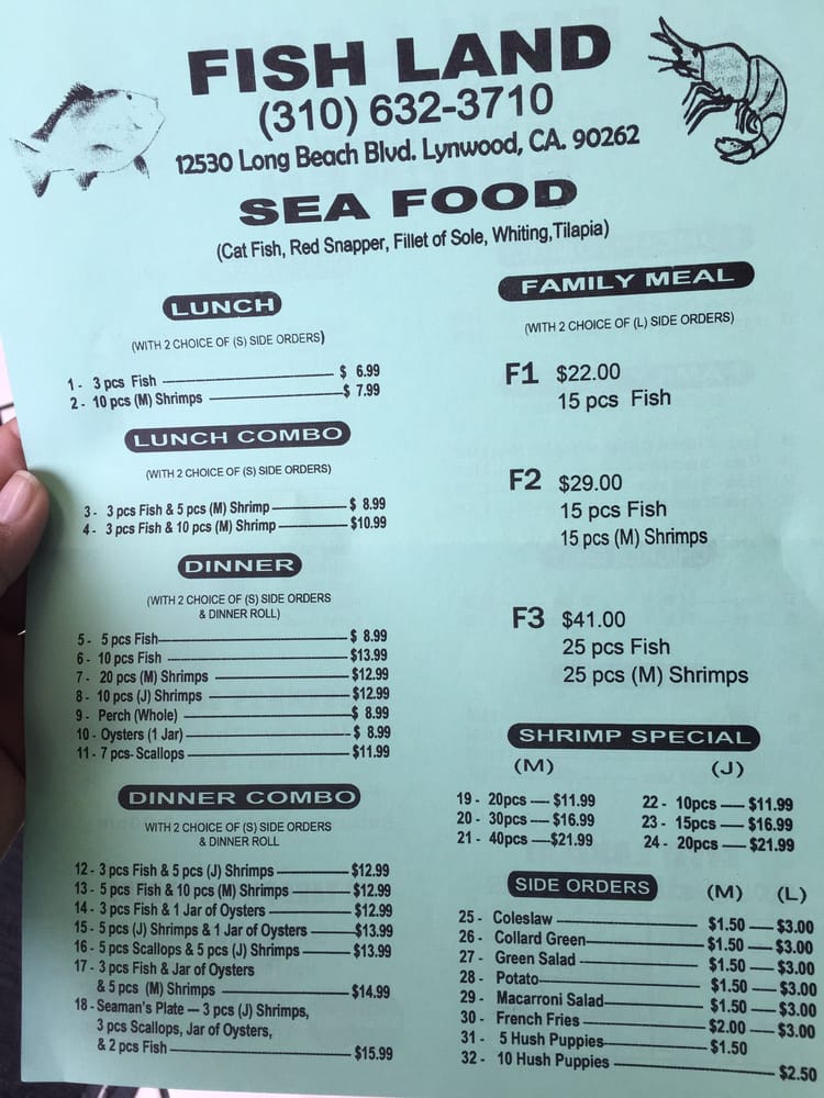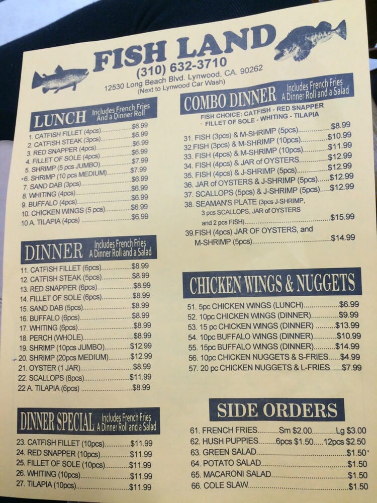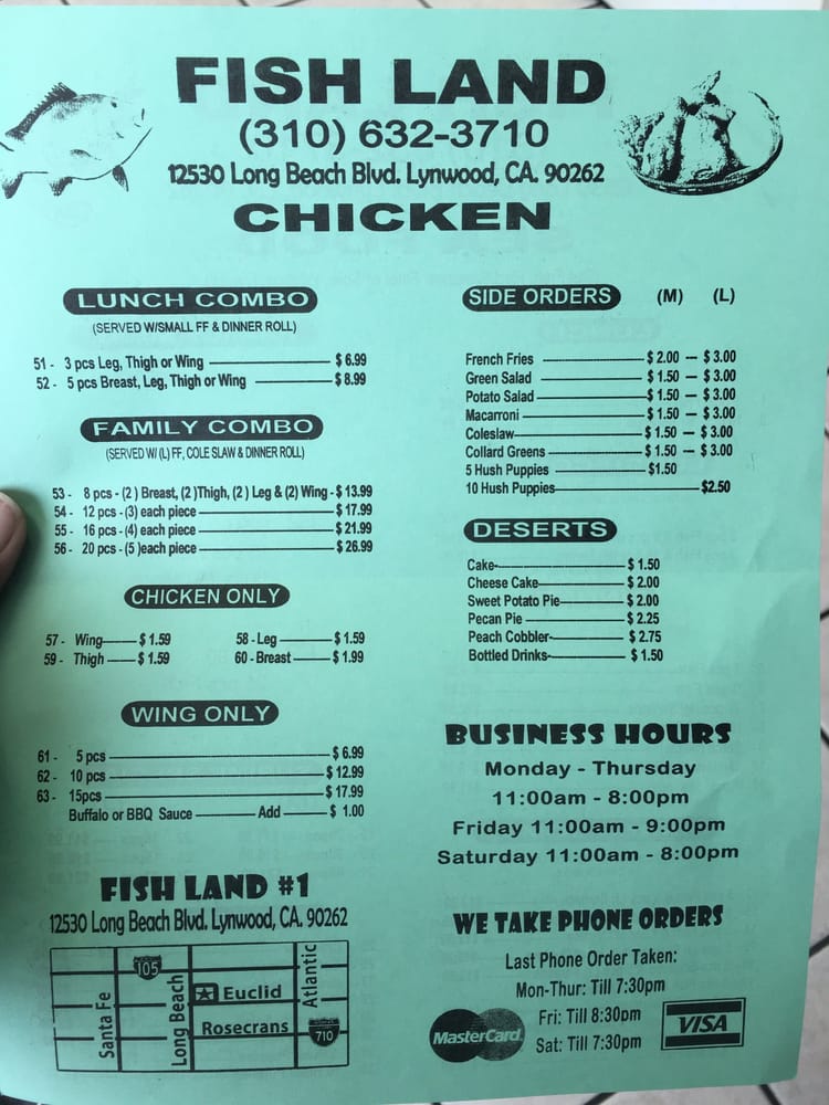 Fish Land located at 12530 Long Beach Blvd Lynwood, CA offers top-notch seafood with outstanding filet of catfish dinners. Customers rave about the fresh, tender, and flavorful fish, especially when fried extra crispy. While the sides like potato salad and coleslaw could use improvement, the main dishes consistently impress. The friendly staff and great customer service enhance the dining experience, making it a must-visit spot for fried fish and all the fixings. With consistent quality and a welcoming atmosphere, Fish Land stands out as a go-to destination for seafood lovers in the area.